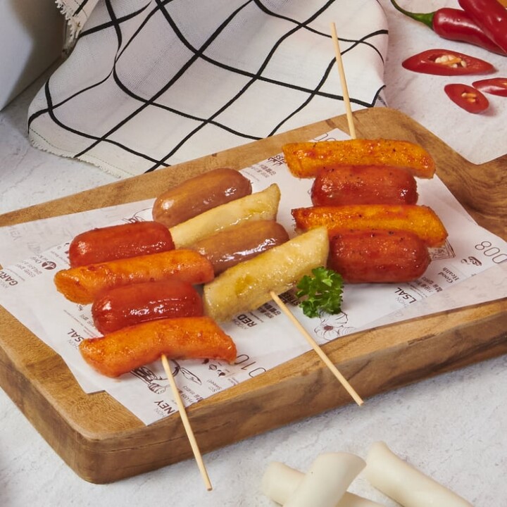 Makanan jalanan Korea yang popular, terdiri daripada kek beras goreng dan sosej ayam yang disalut dengan sos Shinhwa kami yang berasap dan pedas.